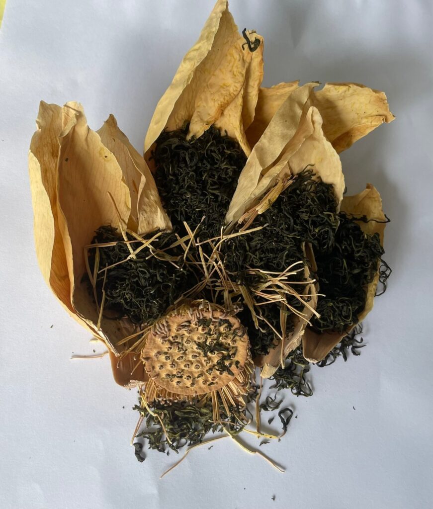 Là một sự kết hợp ủ hương cổ truyền giữa các dòng trà Tân Cương Thái Nguyên và loại hoa sen trắng cổ Huế (loài sen có hàm lượng tinh dầu và alkaloid cao hơn nhiều sen thường), bản thân trà đã hấp thu giao hương hiếm có, được sấy thăng hoa giữ gần như toàn bộ phân tử hương & tinh dầu nguyên sinh của sen, không phá cấu trúc tế bào → giữ lại sắc – chất – khí hoàn chỉnh sau đó được ủ thời gian từ 12–36 tháng.